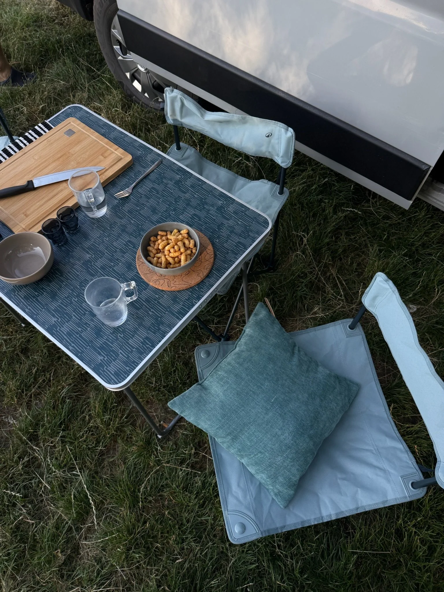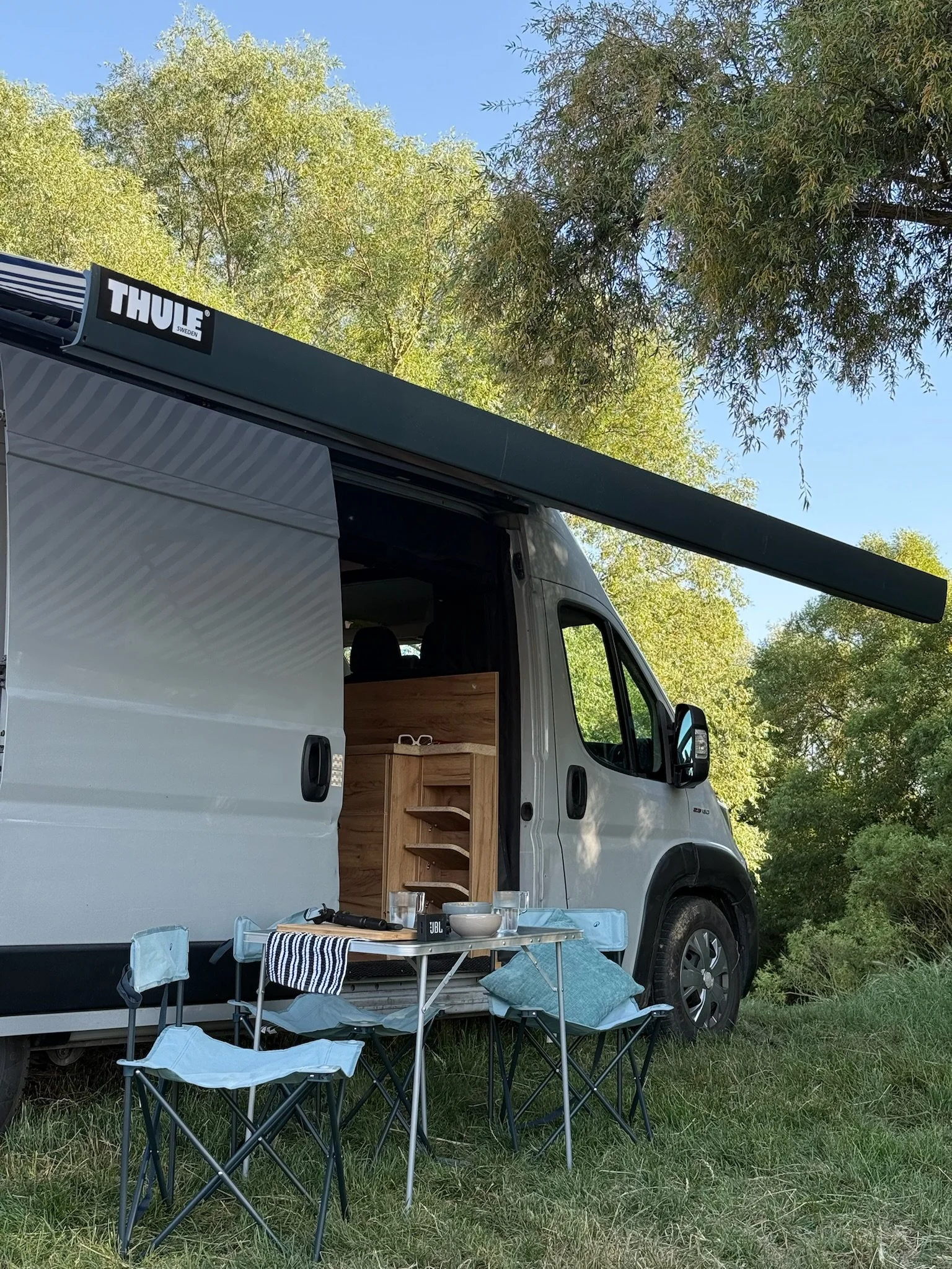 Our Fiat ducato subtly blends into the regular traffic. Pale gray color ensures the right temperature inside, even when you park on the sun. Not one, but two sky lights providing daylight and much needed ventilation on a hot day will make your stay as pleasurable as it gets. Rich in its size, providing lots of storage and headroom. Equipped with parking sensor and position lights, to ensure you will never have an issue with manouvering or parking. High quality, independent awning will always come handy when enjoing the fresh air by your van. Plenty of emergency measures are included too, such as first aid kit, spare wheel + equipment, fire extinguisher and more. Feel free to ask about the details.